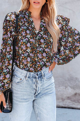Multicolor Floral Print Ruffled Long Sleeve V-Neck Blouse