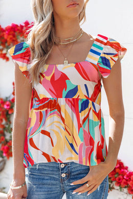 Embroidered Detail Floral Print Ruffle Trim Tank Top