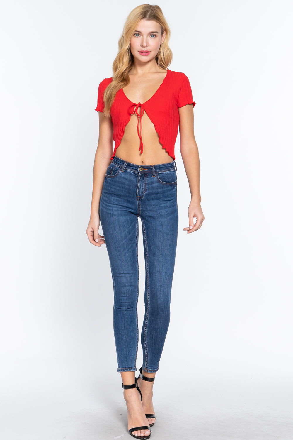 3. Cardigan Details: A short sleeve cardigan with a front tie detail, featuring lettuce edge trim and variegated rib fabric for a stylish and textured look.