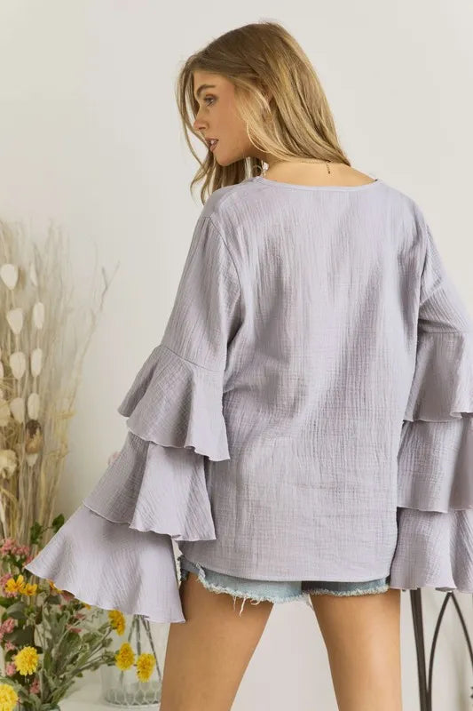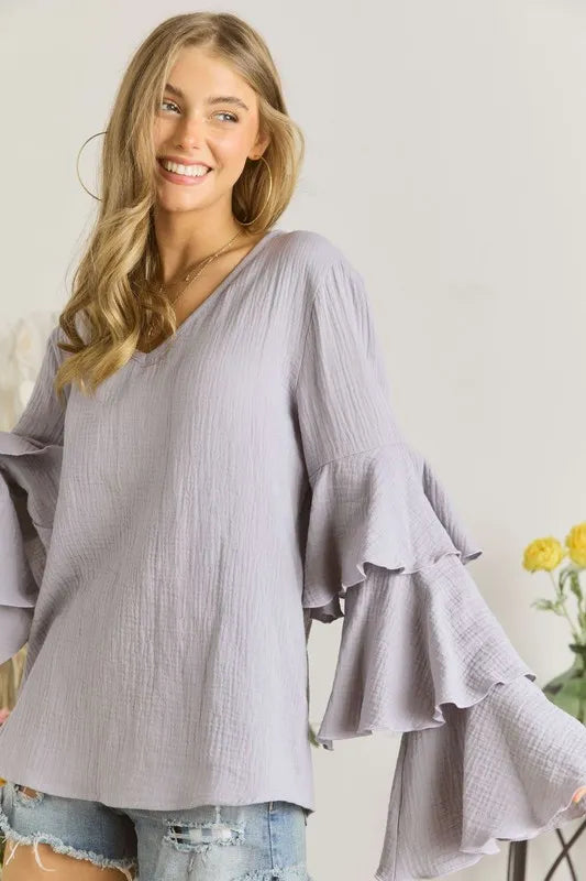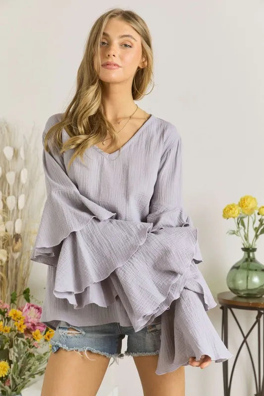 The Layered Bell Sleeve Blouse features a trendy and feminine design with layered bell sleeves. This stylish detail adds a touch of elegance and sophistication to the blouse. Perfect for both casual and dressed-up occasions, this blouse is versatile and chic.