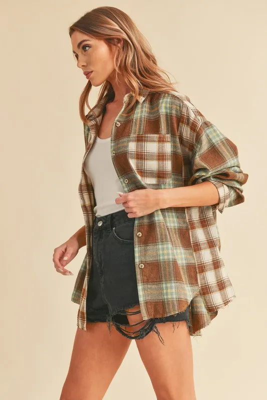 The Frayed Hem Plaid Button Up Flannel Shirt is a trendy and edgy garment with a plaid pattern and frayed hem detailing. The button-up front closure adds a classic touch to this modern design. The frayed hem provides a distressed and casual look, perfect for a stylish and laid-back outfit. Pair this shirt with jeans or leggings for a cool and fashionable ensemble.