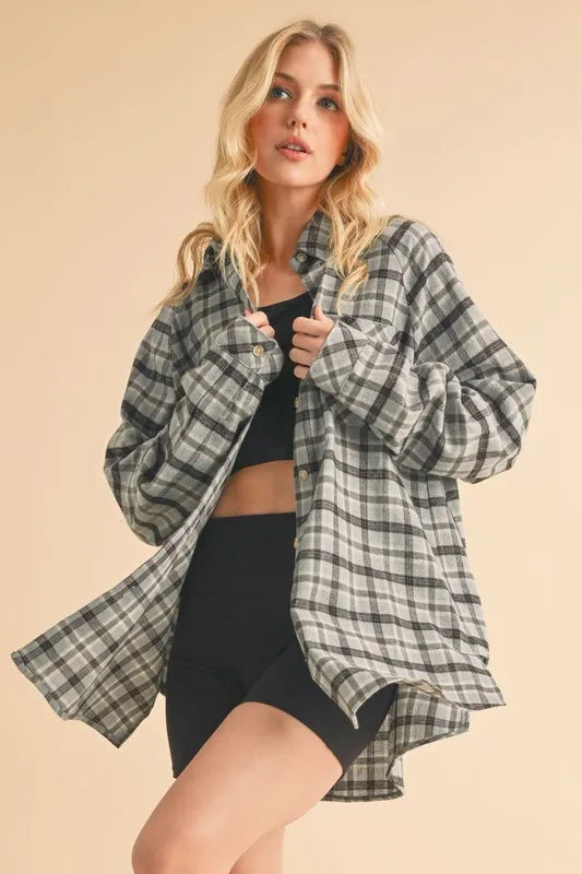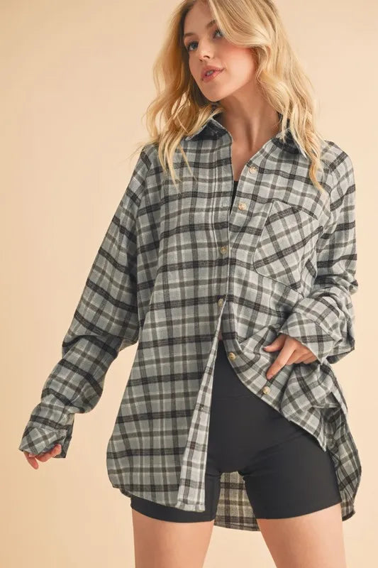 The Plaid Button Up Flannel Shirt with Chest Pocket is a classic and versatile shirt designed with a plaid pattern and button-up front closure. It features a chest pocket, adding a practical element to the shirt's style. This flannel shirt is perfect for creating a casual and laid-back look, while the plaid pattern adds a touch of timeless appeal. Pair it with jeans or leggings for a comfortable and stylish outfit.