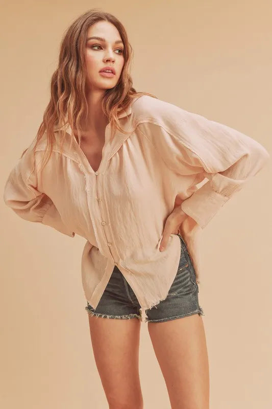 The Raw Hem Button Down Raglan Sleeve Shirt is a fashionable and on-trend piece for your wardrobe. The raw hem detailing adds a casual and edgy vibe to the shirt. Featuring a button-down front and raglan sleeves, it offers a classic yet contemporary look. The raglan sleeves provide a comfortable and relaxed fit. This shirt is versatile and can be styled in different ways, making it a perfect choice for both casual and smart-casual outfits.