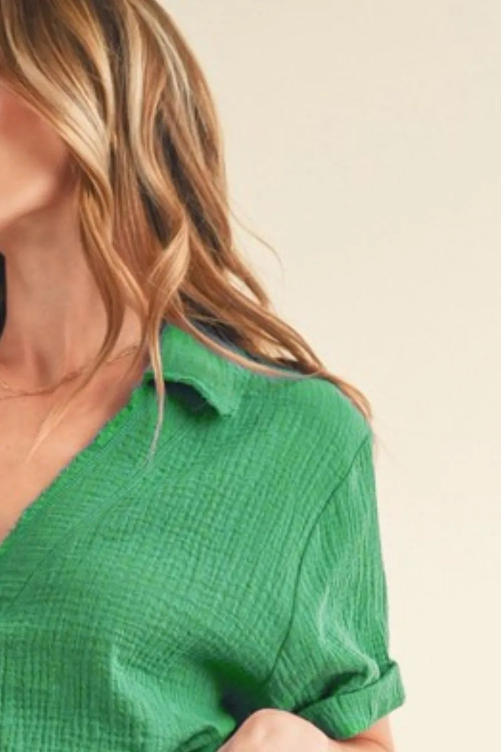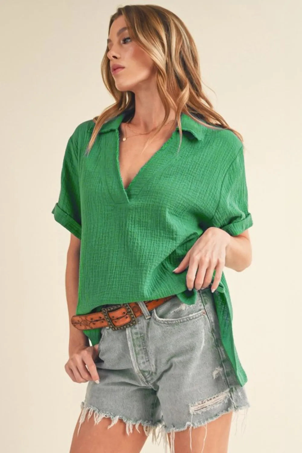 The Side Slit Johnny Collar Short Sleeve Cotton Gauze Blouse features a stylish design with functional elements. The side slits add movement and detail to the blouse, while the Johnny collar offers a modern twist on traditional collars. Made from breathable cotton gauze fabric, this blouse is comfortable and versatile for various occasions. With its short sleeves, it's perfect for warm weather and can be dressed up or down effortlessly.