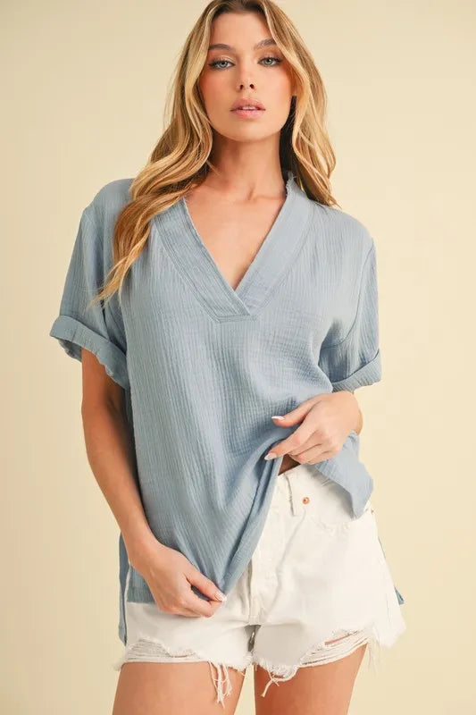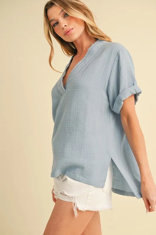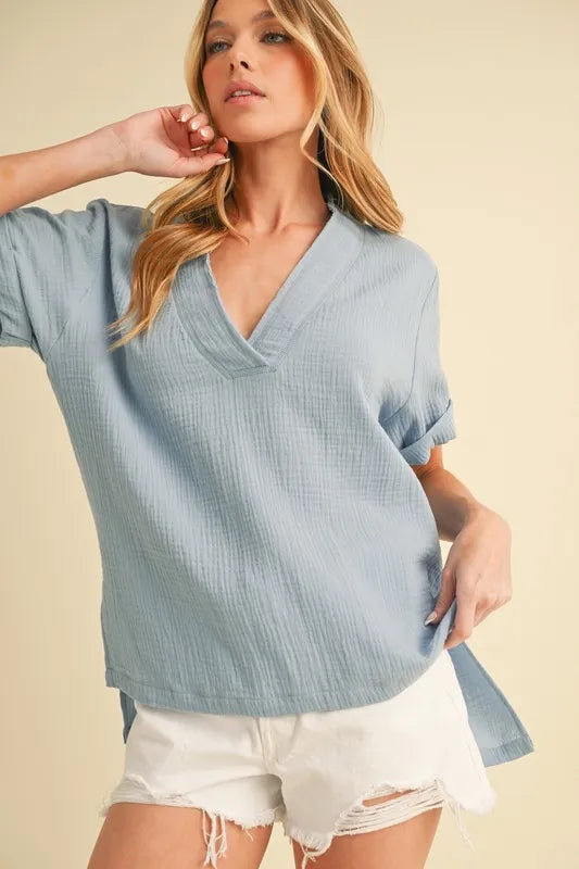 The Side Slit V-Neck Short Sleeve Blouse is a chic and modern top that combines style with a hint of sophistication. The V-neckline adds a flattering touch to the neckline, while the short sleeves offer a comfortable and breezy fit. The side slits on the blouse provide a stylish detail and allow for ease of movement. This versatile piece can be dressed up or down, making it a perfect choice for a variety of occasions.