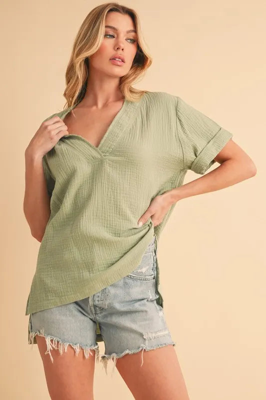 Aemi + Co Side Slit V-Neck Short Sleeve Blouse