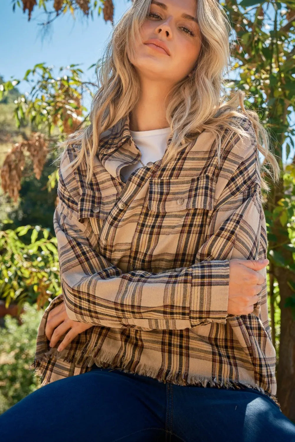 The Button Up Raw Hem Plaid Shirt is a versatile and fashion-forward piece to add to your wardrobe. With its classic plaid pattern and modern raw hem detailing, this shirt offers a unique and stylish look. The button-up design adds a polished touch, making it easy to dress up or down for any occasion. The relaxed fit ensures all-day comfort, while the plaid print adds a timeless appeal. Pair it with your favorite jeans or trousers for a chic and on-trend outfit. Stay ahead in style with this must-have button-up plaid shirt.