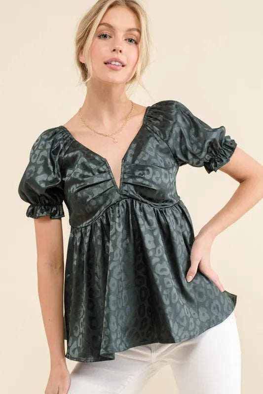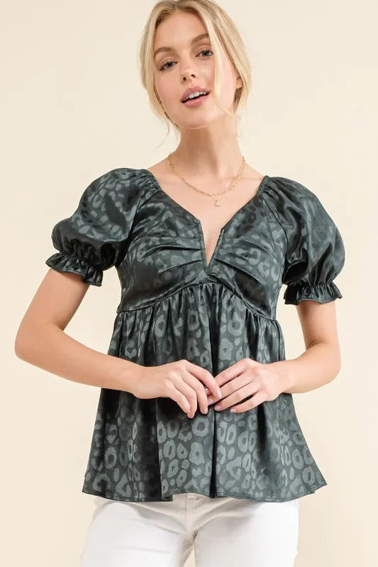And The Why Satin Leopard V Wired Puff Sleeves Blouse