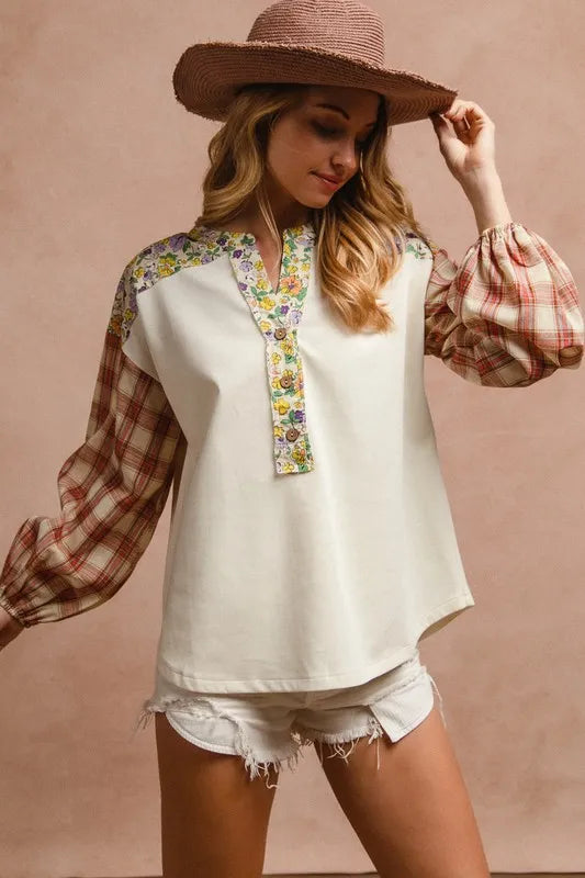 A unique style statement, the Floral Notched Plaid Balloon Sleeve Top combines a floral print with a plaid pattern. The notched neckline adds a touch of elegance to the top's design. Featuring voluminous balloon sleeves, it offers a dramatic and trendy look. This imaginative combination of elements creates a standout piece that blends different textures and patterns.
