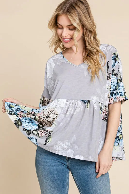 A peplum floral V-neck half sleeve blouse is a chic and feminine top with a flattering silhouette. The peplum design accentuates the waist and adds a touch of elegance to the blouse. The floral pattern gives it a romantic and trendy vibe, while the V-neckline adds a hint of sophistication. This blouse with half sleeves is perfect for both casual and dressier occasions, offering a stylish and versatile option for your wardrobe.
