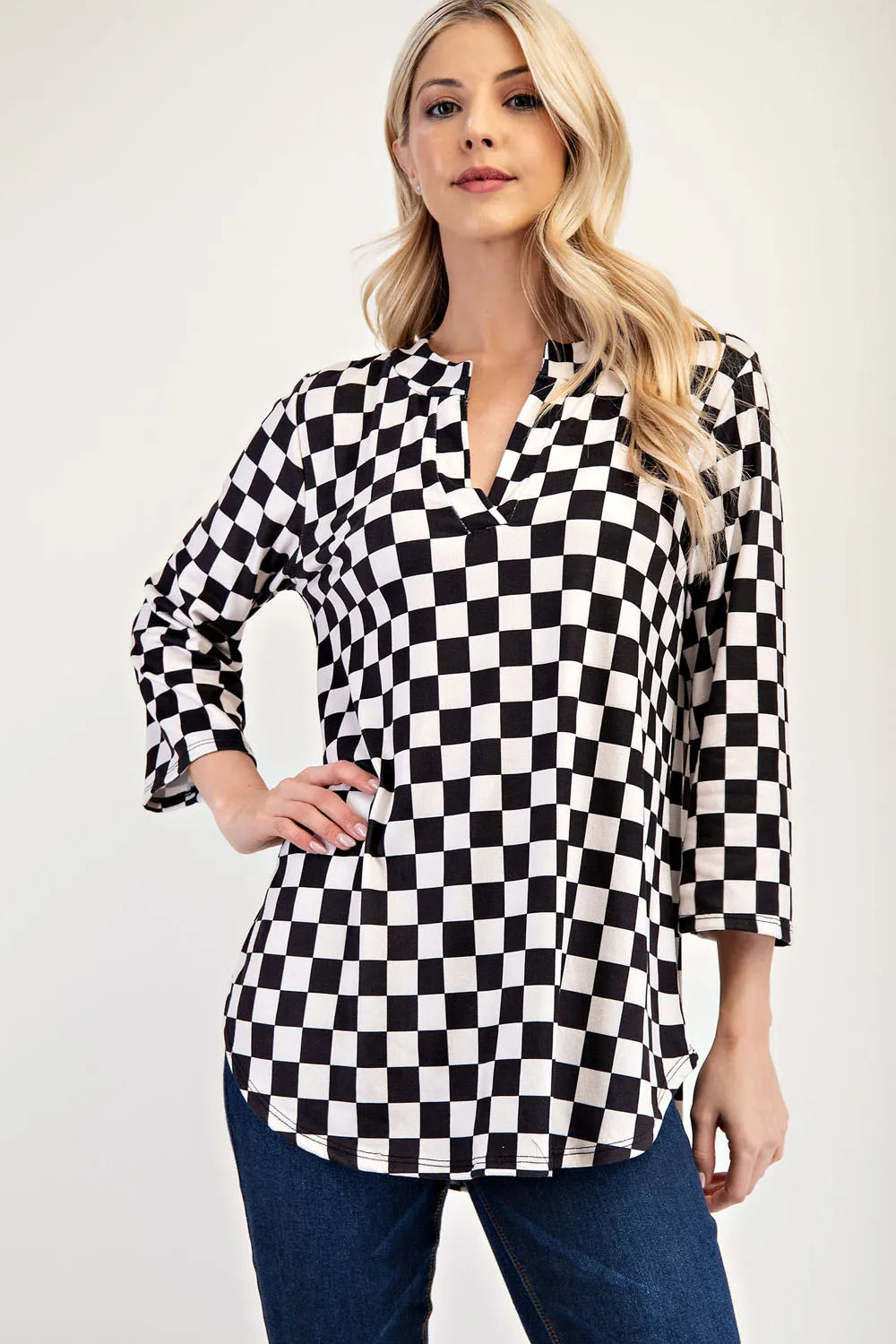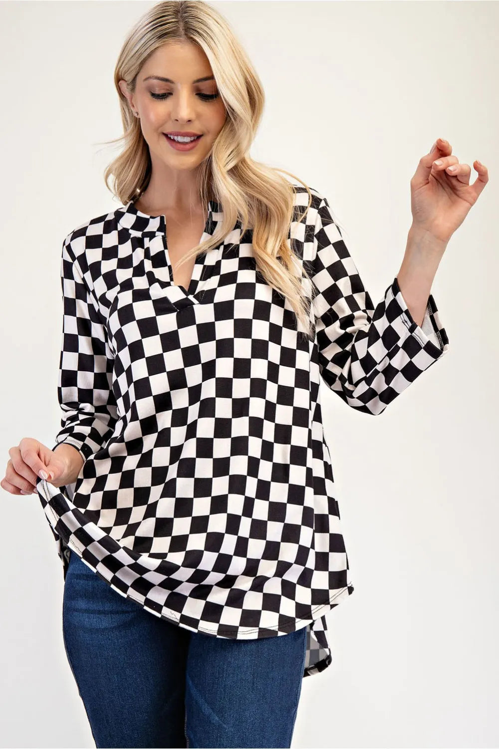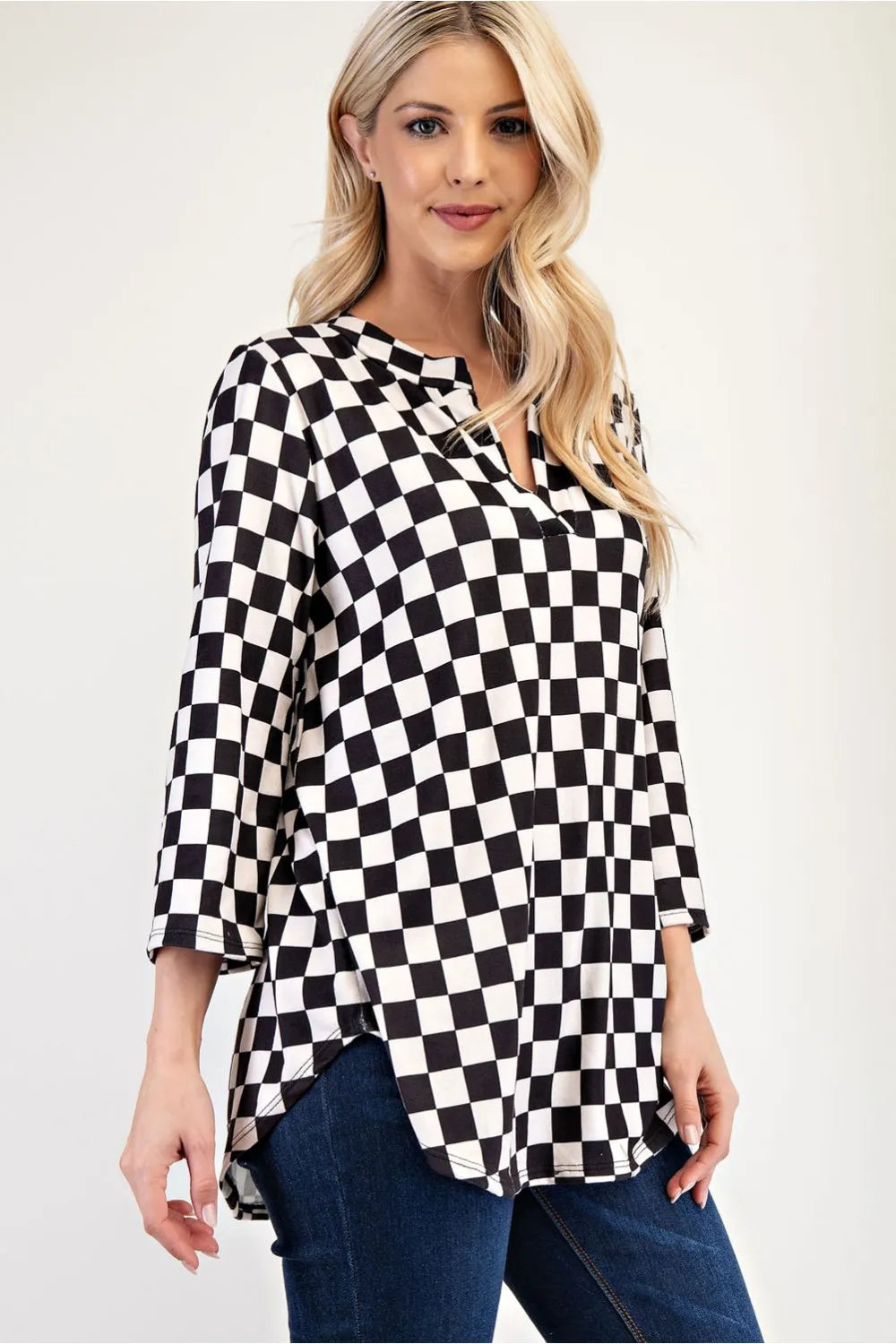 A Curved Hem Checkered Notched Blouse is a versatile and stylish piece for your wardrobe. This blouse typically features a checkered pattern, which adds a classic and timeless touch to the design. The curved hem adds a flattering detail, often giving the blouse a more relaxed and flowy fit.
