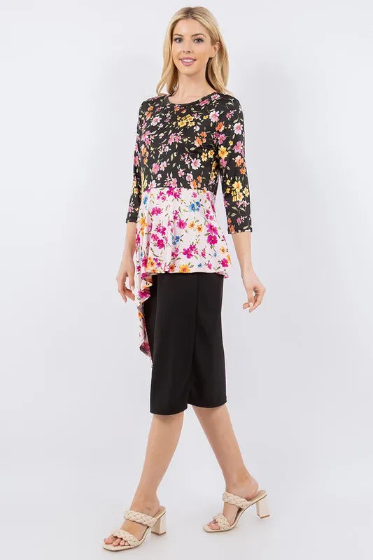 Celeste Full Size Floral Asymmetrical Hemline Round Neck Top Plus Size