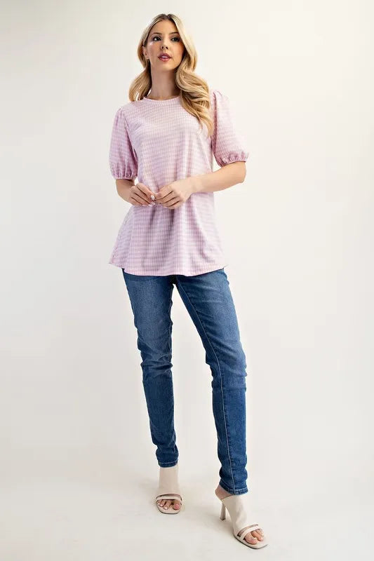 This tunic top is sophistication and class. It features gorgeous Gingham print and a round neckline with puff sleeves. The sleeves have a unique design, they have puff sleeve detail. This top is made from the softest knit you will ever wear. This top is easy to style, pair this style with your favorite bottoms, and favorite accessories! You will look effortlessly beautiful!