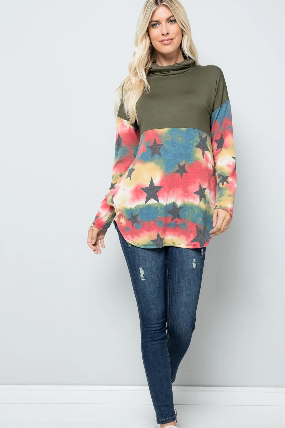 A tie-dye star print long sleeve blouse is a fun and eye-catching top that combines two popular trends: tie-dye and star prints. The tie-dye design adds a playful and colorful element to the blouse, creating a unique and whimsical look. The star print detailing adds a touch of fun and adds interest to the overall design.