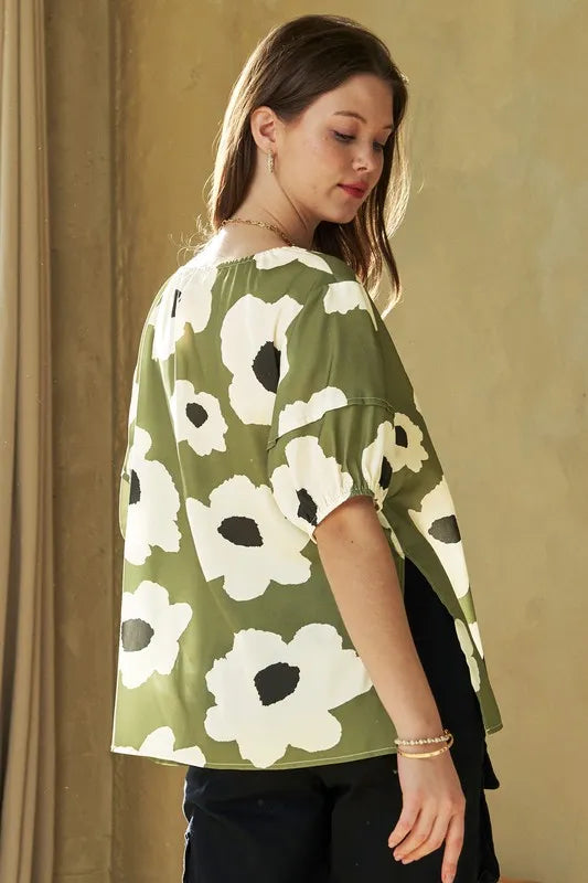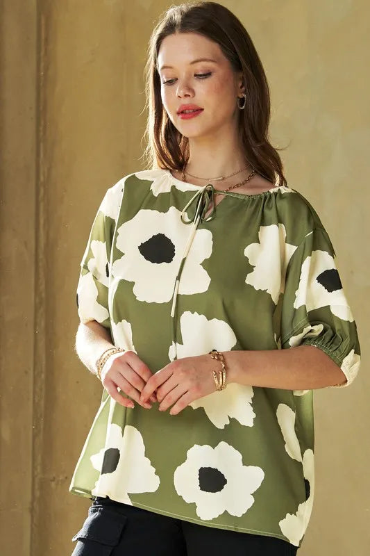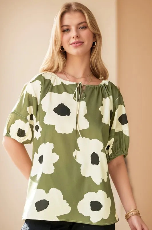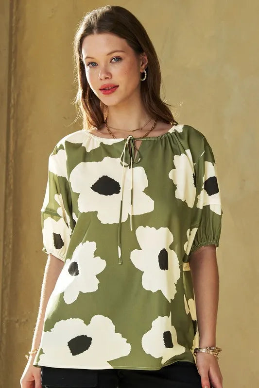 A floral tie-front puff short sleeve blouse top is a charming and feminine piece with delicate floral patterns and trendy design elements. This blouse features a tie-front detail that adds a touch of sweetness and a flattering silhouette. The puff sleeves add a stylish and romantic flair to the top, making it perfect for a chic and effortless look. Pair it with jeans or a skirt for a versatile outfit that exudes summer style.