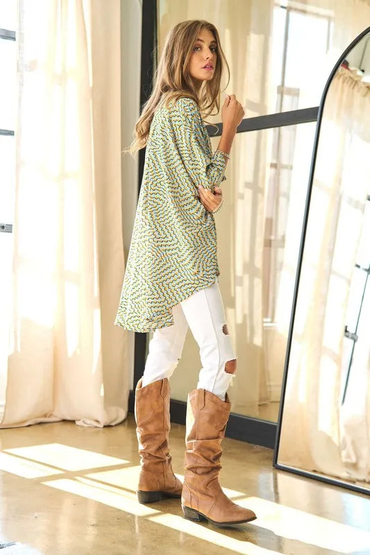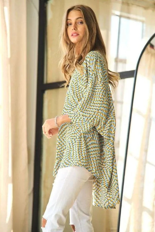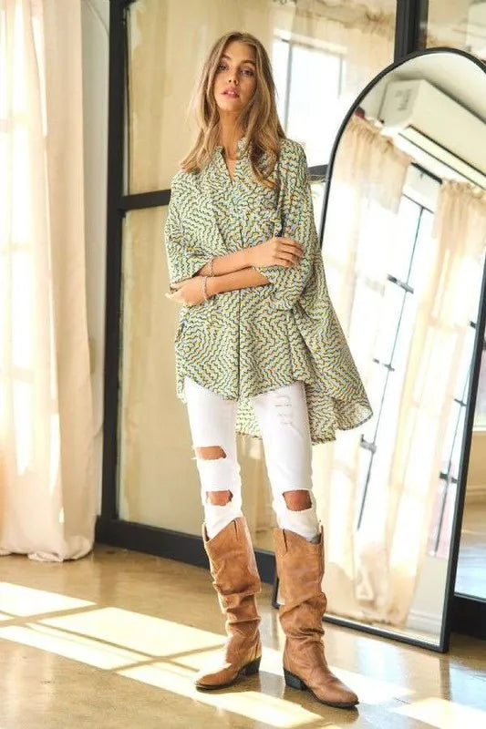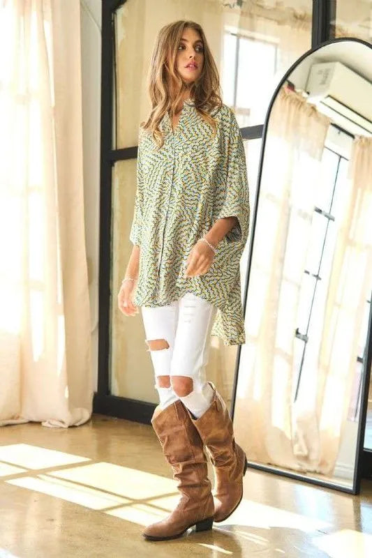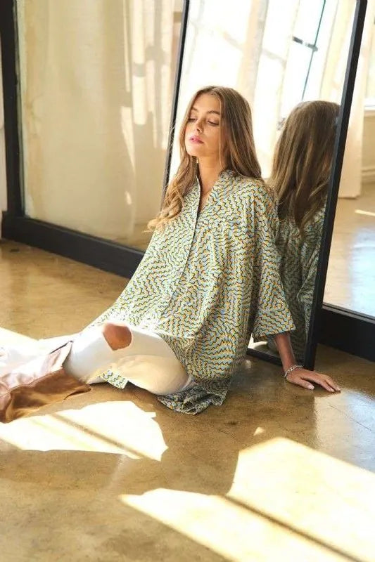 A geo printed relaxed fit flowy button-down shirt is a stylish and comfortable top that offers a blend of geometric print, relaxed fit, and flowy silhouette. It can be dressed up or down to suit various occasions, making it a versatile wardrobe staple. The button-down style adds a classic touch, while the relaxed fit and flowy design ensure comfort and ease of movement. Pair this shirt with jeans for a casual look, or dress it up with tailored pants for a more polished ensemble.