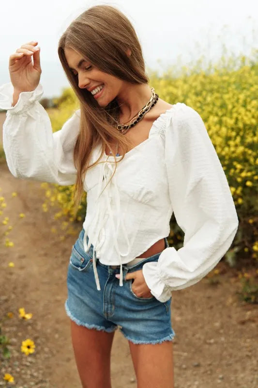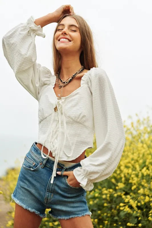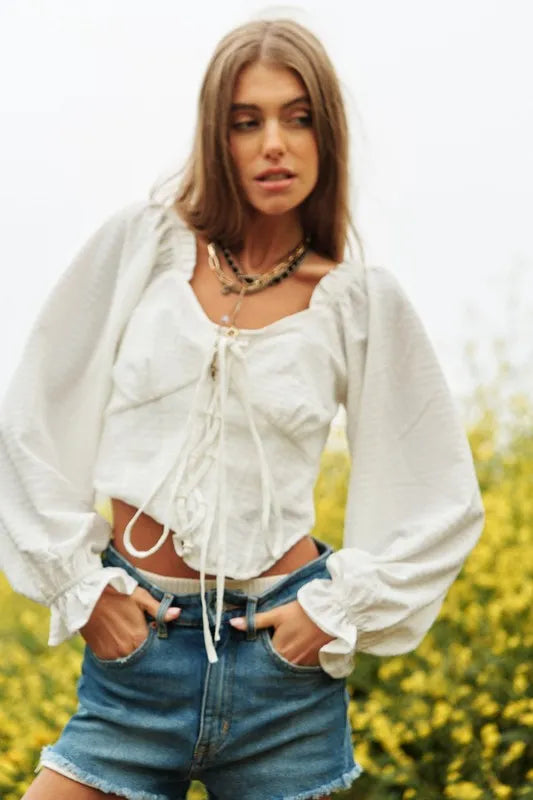 A strap front corset look long puff sleeve blouse combines modern and classic elements for a stylish ensemble. The strap front detail adds a contemporary touch to the traditional corset style, while the long puff sleeves create a bold and feminine statement. This blouse is versatile, perfect for dressing up or down to suit various occasions with confidence and flair.