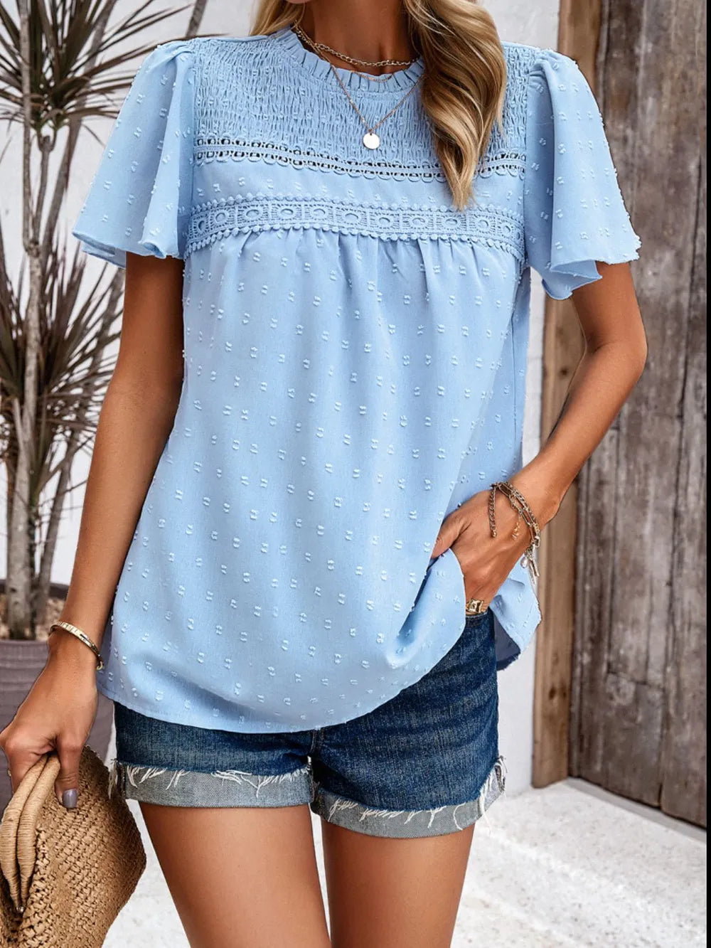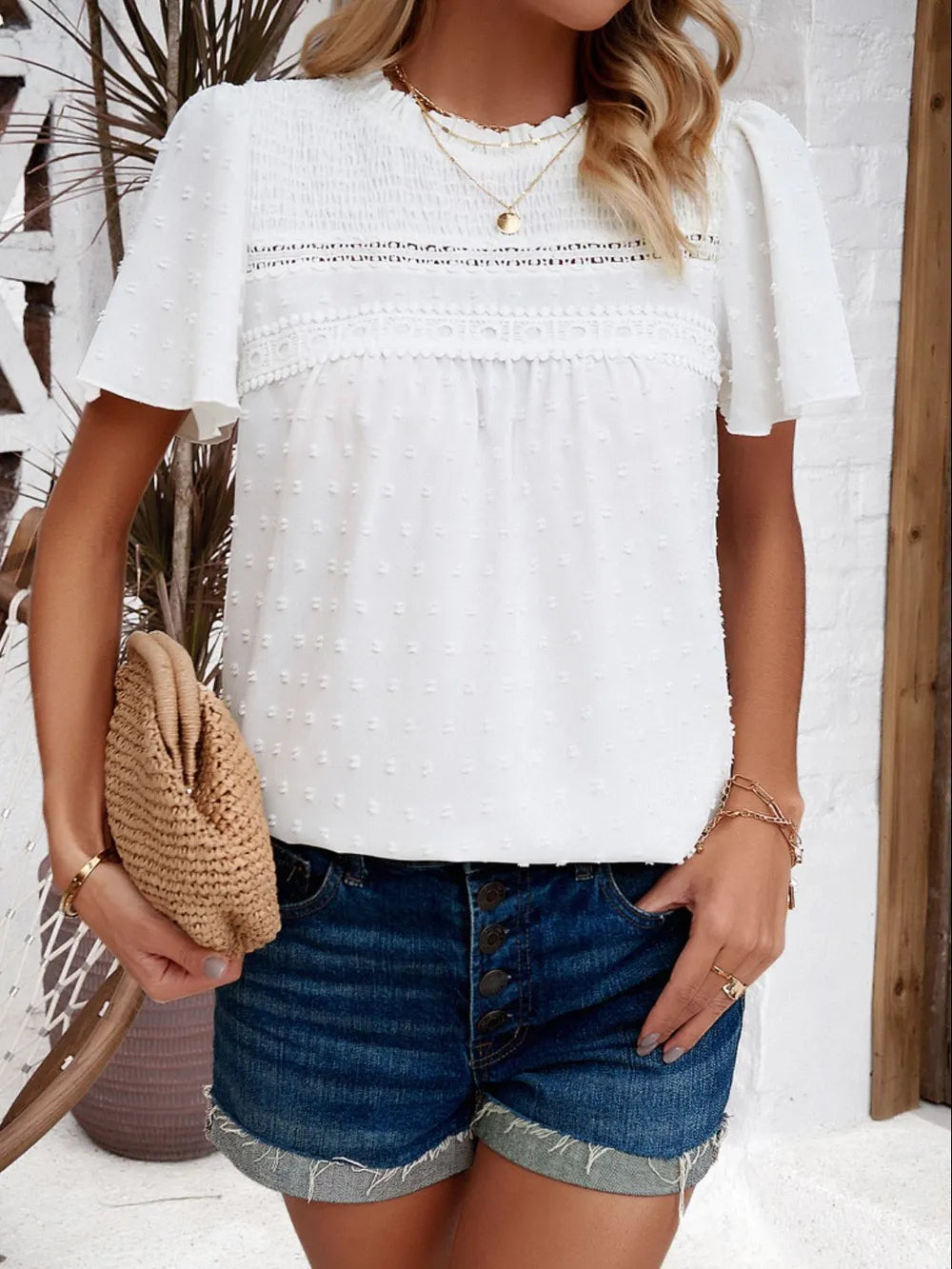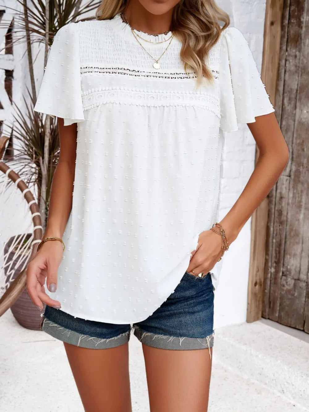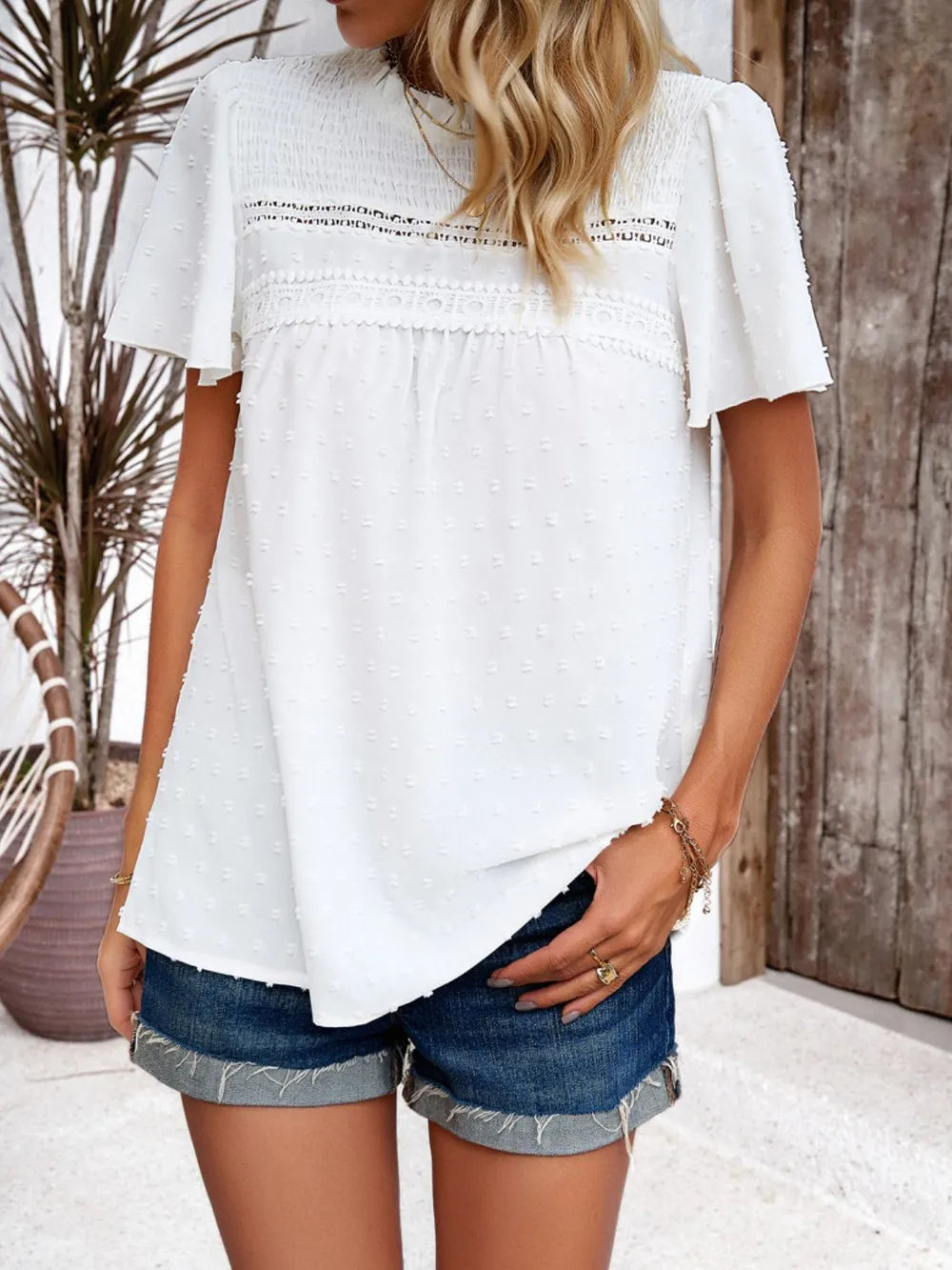 - Features: Smocked, Swiss dot