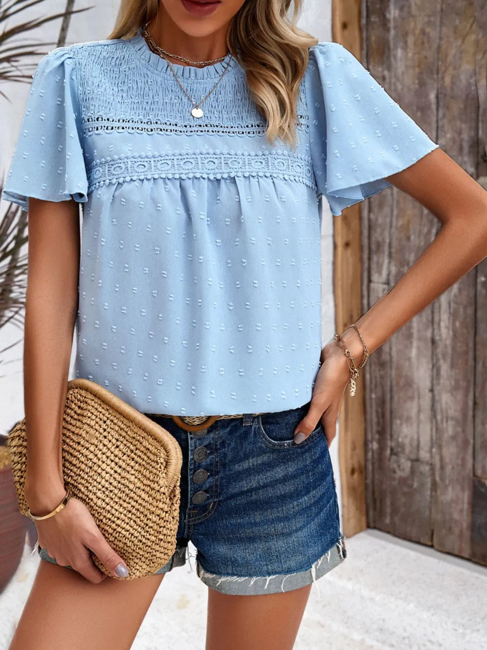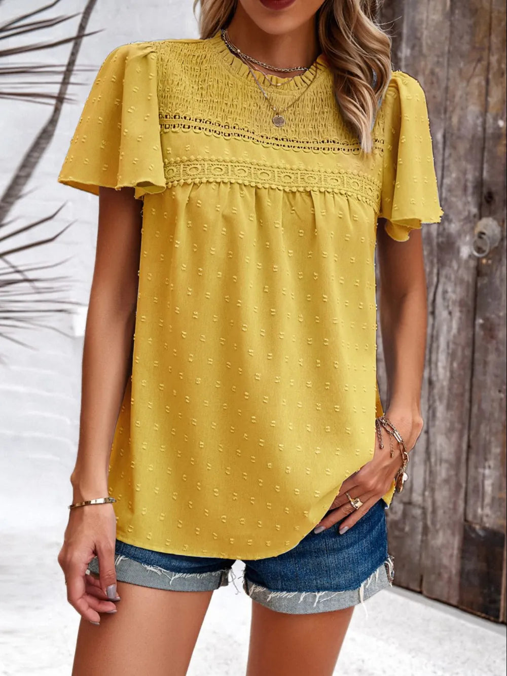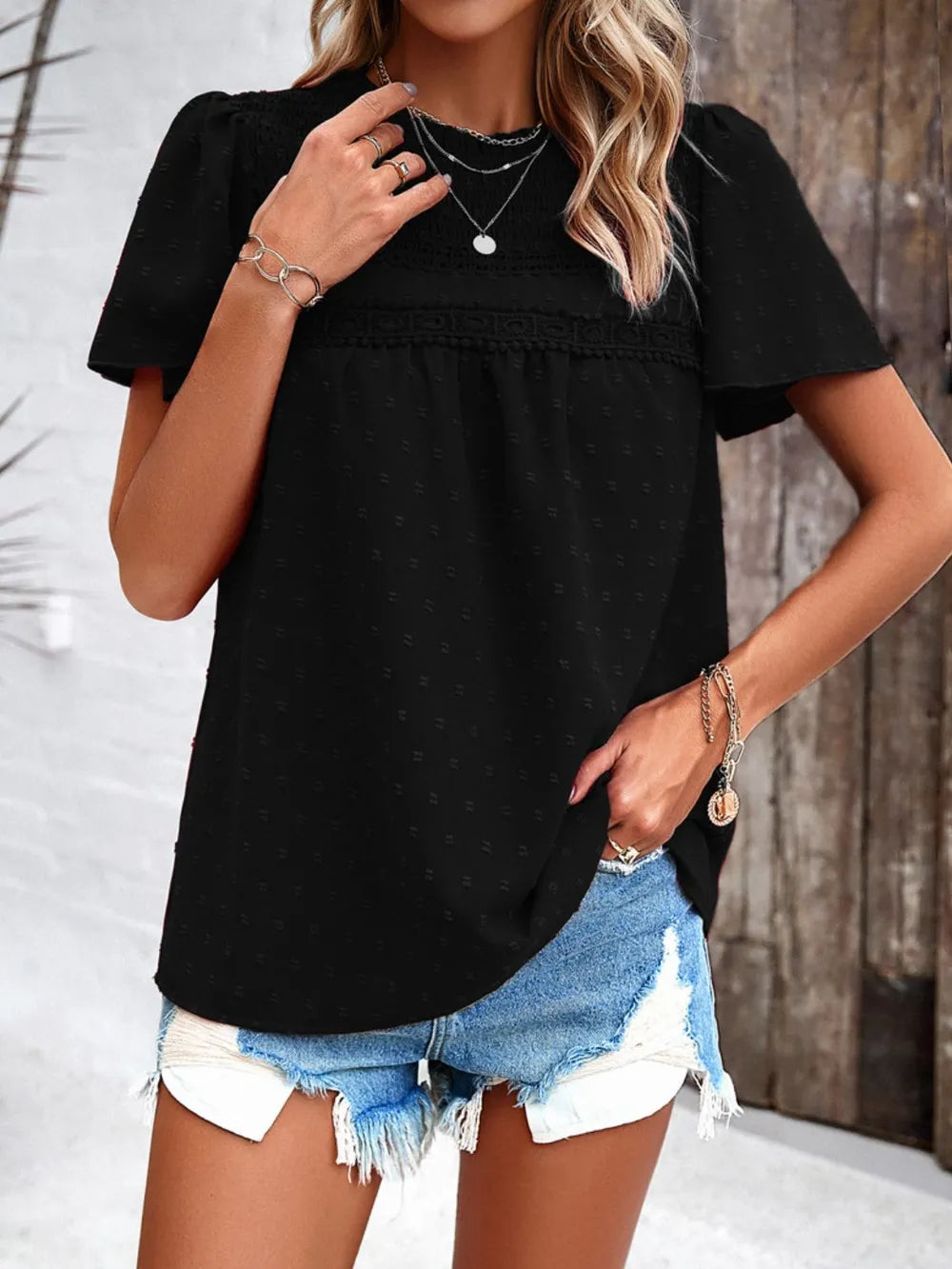 - Features: Smocked, Swiss dot