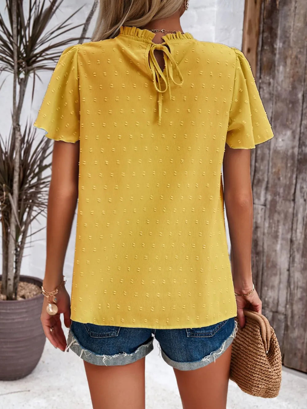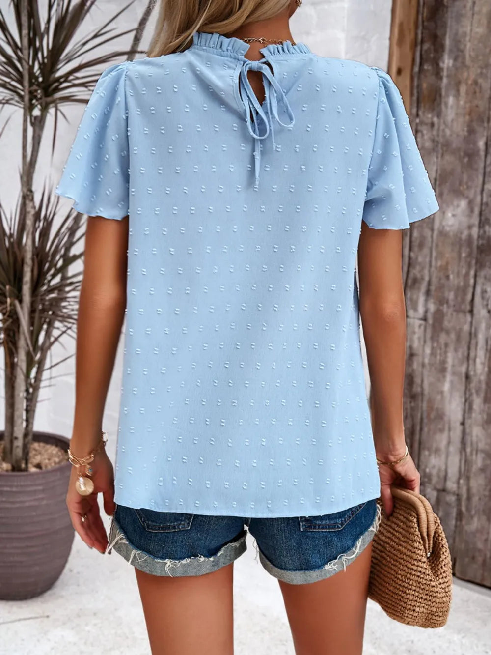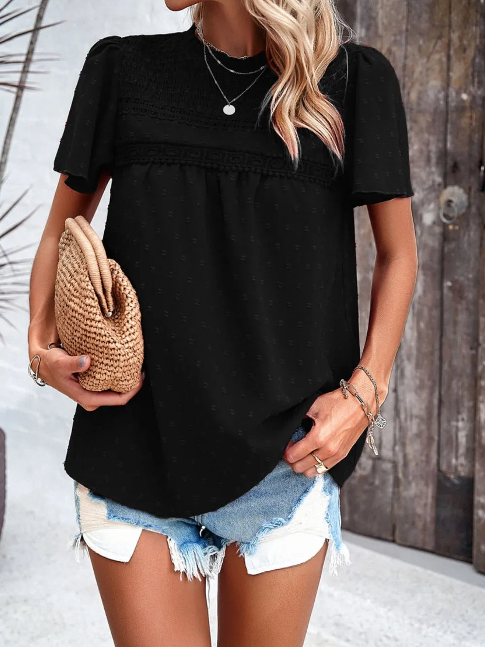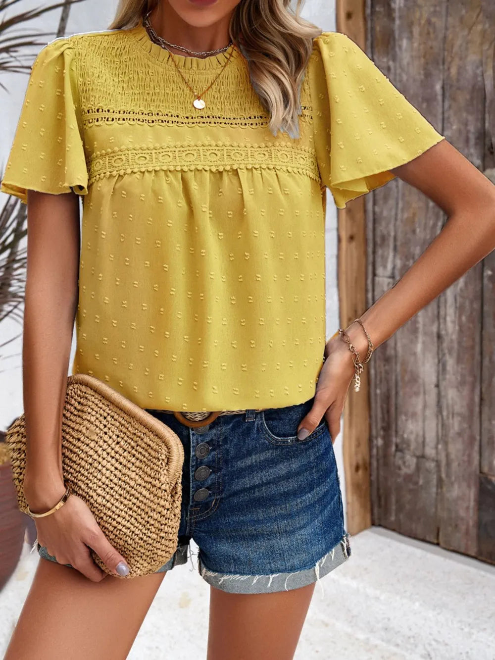 - Features: Smocked, Swiss dot