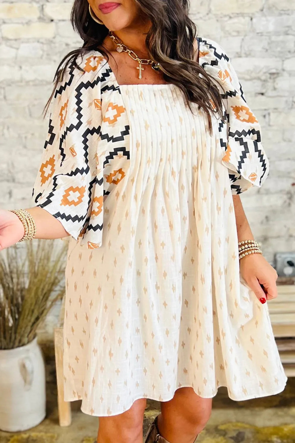 Geometric Square Neck Half Sleeve Mini Dress