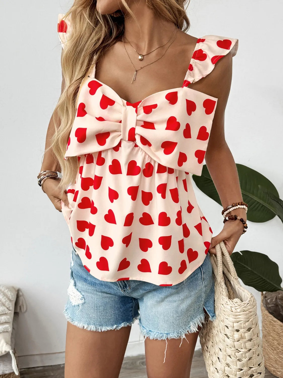 This charming peplum blouse features an all-over heart print pattern in red against a white background, creating a sweet and romantic look. The design includes a statement bow at the front, flutter cap sleeves, and a flattering peplum hem that adds feminine flair. Made from lightweight fabric suitable for warm weather wear, this blouse combines comfort with style. The sweetheart neckline and fitted waist create a figure-flattering silhouette. Perfect for casual outings, date nights, or Valentine's Day celebrations. The versatile design can be paired with jeans, shorts, or skirts for various styling options.