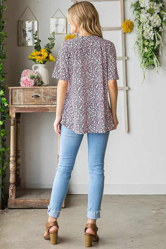 Heimish Full Size Short Sleeve Crisscross Animal Babydoll Top Plus Size