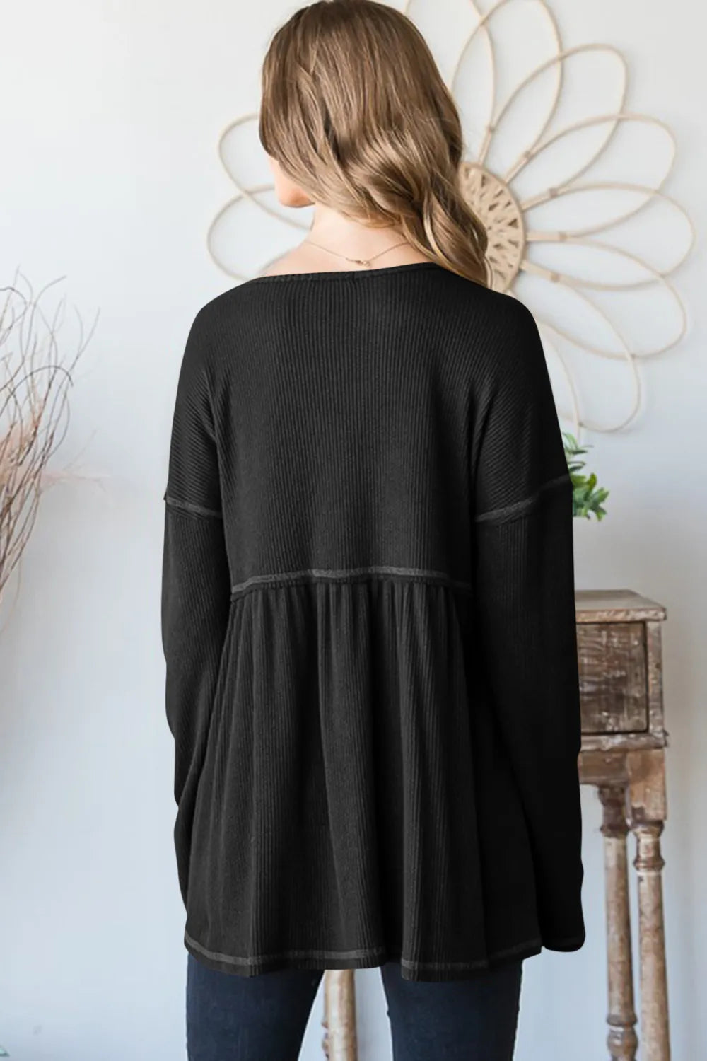 This babydoll top features a flattering V-neck design and long sleeves. The ribbed texture adds a unique touch to the top, creating a stylish look. It is versatile and can be dressed up or down for various occasions. Elevate your outfit with this chic and comfortable V-neck babydoll top with long sleeves.