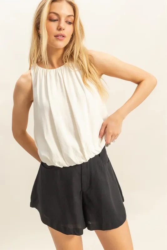 The Bubble Hem Round Neck Sleeveless Blouse is a versatile and stylish addition to your wardrobe. This blouse features a flattering round neck and a unique bubble hem detail, adding a charming and playful touch to the classic sleeveless design. The relaxed fit and sleeveless style make it perfect for layering or wearing on its own during warm days. Pair this blouse with tailored pants or a skirt for a chic and effortless look that can take you from day to night.