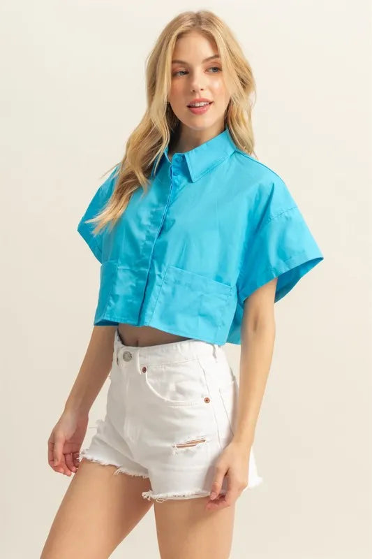 A collared neck short sleeve crop shirt is a trendy and versatile piece of clothing. It can be paired with high-waisted bottoms for a stylish look. The collar adds a touch of sophistication to any outfit.