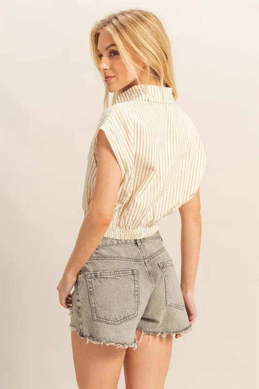 Elevate your casual style with the Striped Elastic Hem Johnny Collar Cap Sleeve Blouse. This blouse features a unique Johnny collar and chic cap sleeves, adding a touch of sophistication to the classic striped design. The elastic hem provides a comfortable and flattering fit, perfect for all-day wear. Pair this blouse with your favorite jeans or trousers for a polished yet relaxed look that is perfect for both work and leisure.