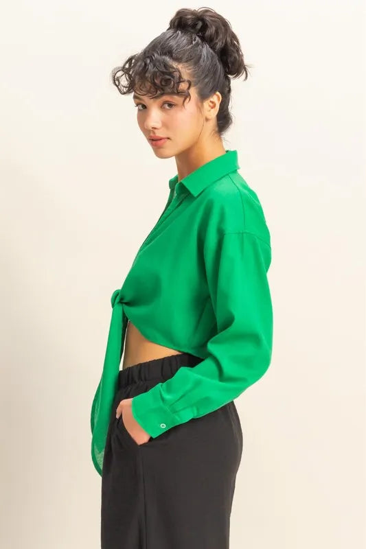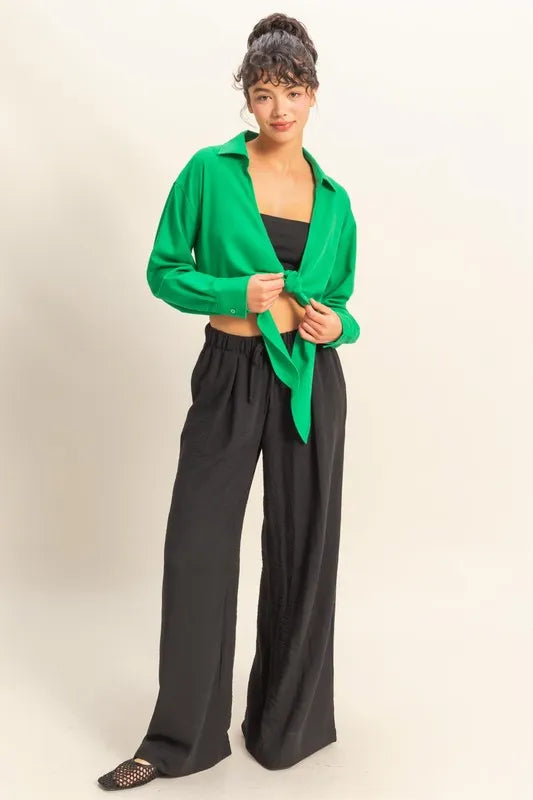 The Washed Tie Front Crop Top is a trendy and versatile wardrobe piece. Featuring a washed fabric finish and a stylish tie front detail, this crop top offers a laid-back and chic aesthetic. Perfect for pairing with high-waisted bottoms, this top is a must-have for creating effortless and fashion-forward looks.