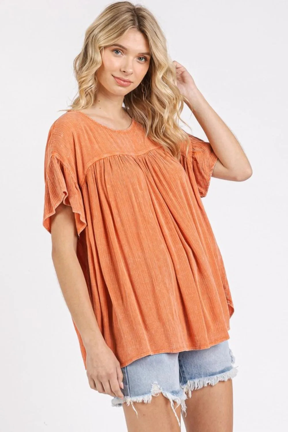 The Mineral Washed Round Neck Ruffle Sleeve Blouse is a charming and stylish top that combines a unique mineral washed fabric with feminine ruffle sleeve details. The mineral wash gives the fabric a vintage and lived-in look, adding a touch of character to the blouse. The round neckline provides a classic touch, while the ruffle sleeves offer a playful and romantic feel. This blouse is versatile and can be dressed up or down, making it a great option for various occasions. Embrace a fashionable yet casual vibe with this lovely blouse that offers a blend of modern and retro elements.