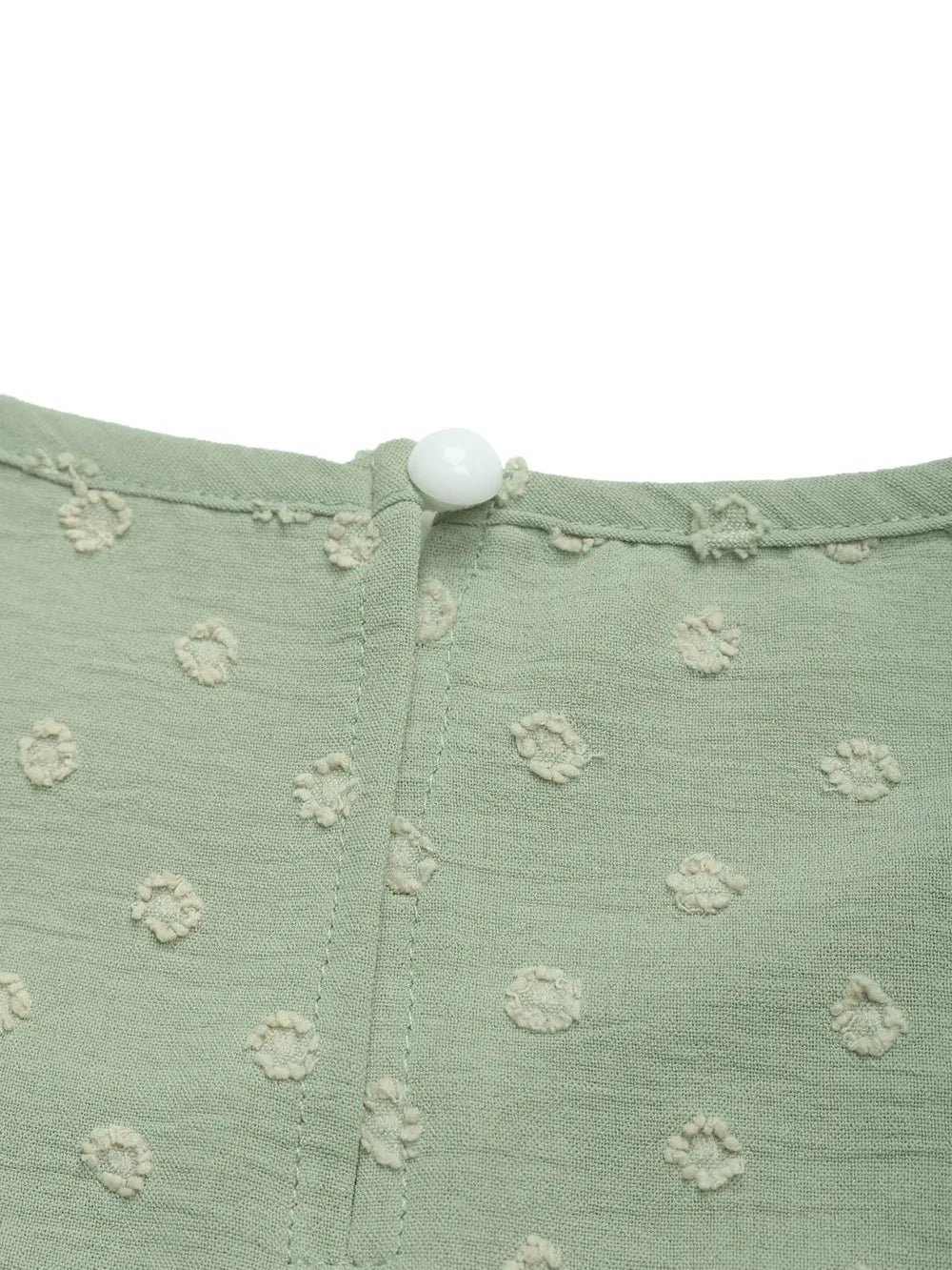 - Features: Ruched, Swiss Dot, Buttoned