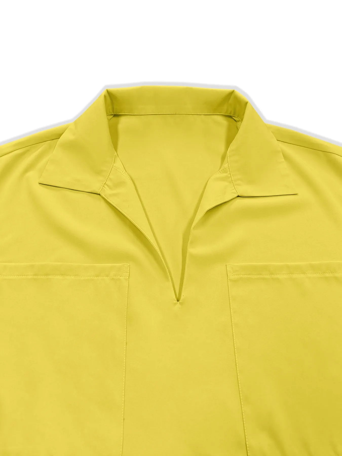 This stylish plus size two-piece set features a relaxed-fit short sleeve shirt with collar and matching shorts in a striking yellow hue. The set is crafted from lightweight, breathable fabric ideal for casual wear. The shirt includes practical chest pockets and a button-down design, while the shorts offer comfort with an elastic waistband. Perfect for summer activities, this set combines style with functionality and can be dressed up or down for various occasions. The material provides ease of movement and all-day comfort.