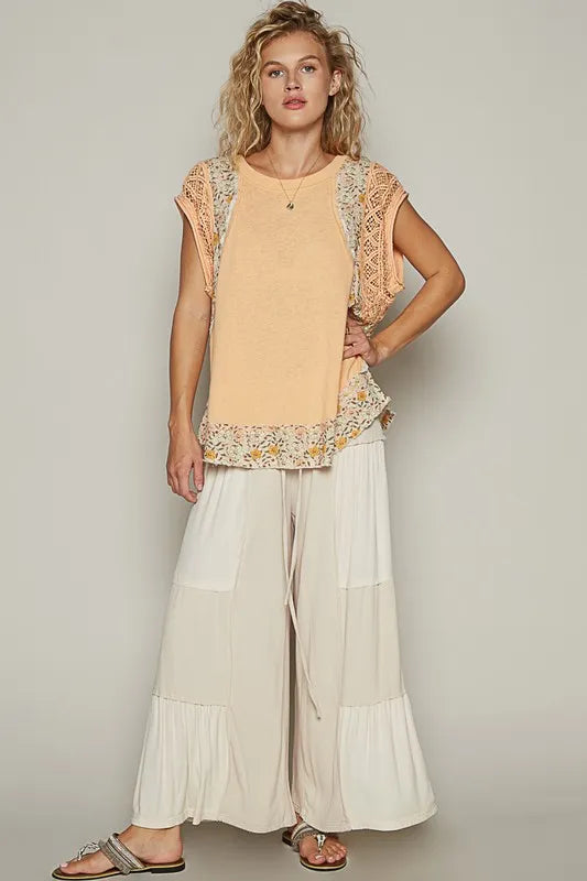 POL Floral Frayed Hem Crochet Cap Sleeve Top