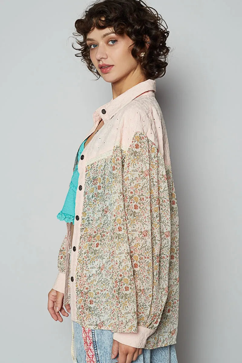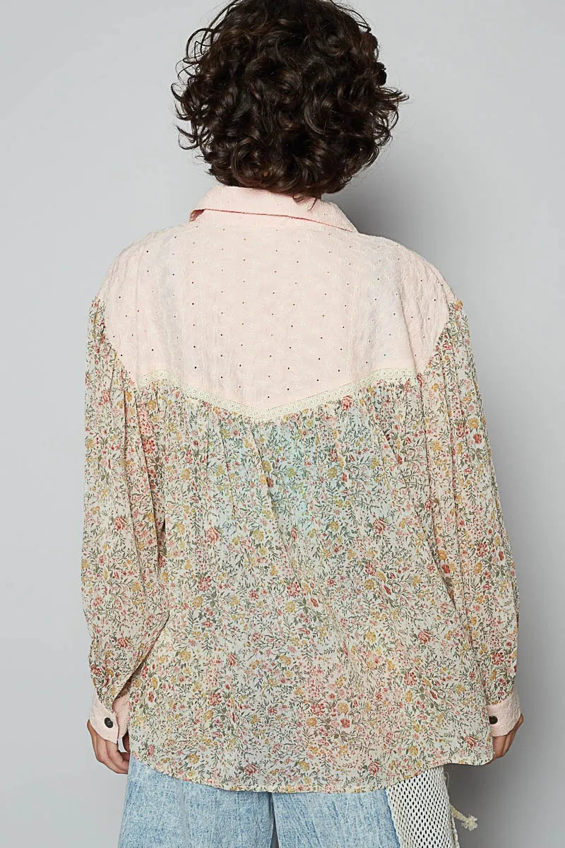 This stylish button-up blouse features a unique color-blocking design with a solid pink yoke contrasting beautifully against floral printed sleeves. Made from lightweight, breathable fabric perfect for warm weather styling. The classic shirt collar and button-front closure offer a polished look while the relaxed fit ensures comfortable wear. Black contrast buttons add a modern touch to this feminine piece. Ideal for layering over tank tops or wearing solo, this versatile blouse transitions easily from casual daywear to evening occasions. The delicate floral print brings a romantic touch while the contemporary color-blocking keeps the look fresh and on-trend.