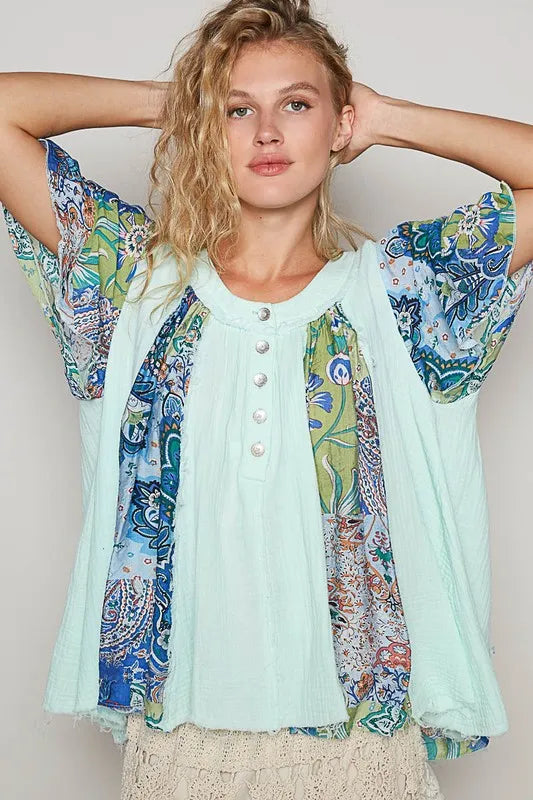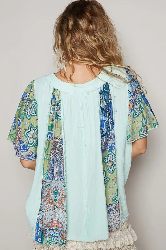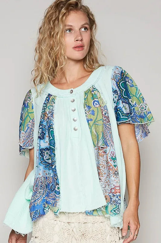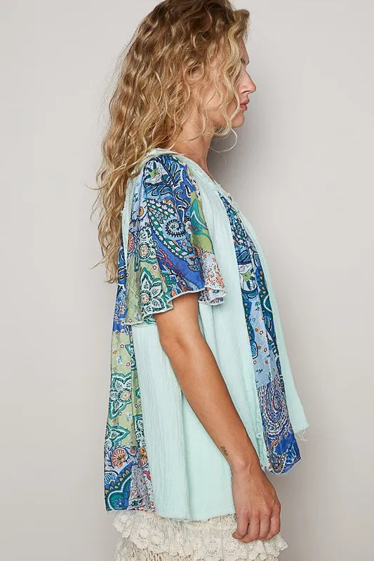 POL Printed Frayed Hem Half Button Short Sleeve Blouse