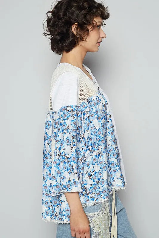 A Washed Floral Print Crochet Detail Top is a stylish and casual top that features a floral print and crochet detailing. The "washed" typically refers to a garment treatment that gives it a slightly faded or vintage look. This type of top is perfect for a relaxed and bohemian-inspired look. The floral print adds a feminine touch, while the crochet detailing adds a charming and delicate element to the design. You can pair this top with jeans, shorts, or a long skirt for a laid-back yet fashionable outfit.