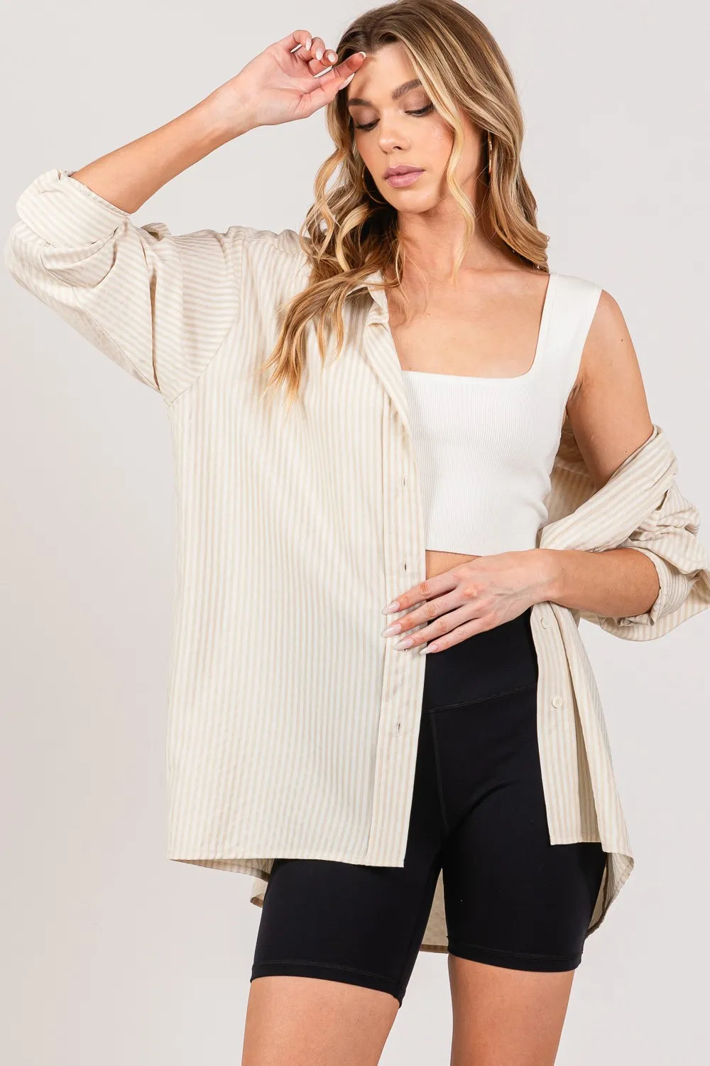 Elevate your casual chic style with this sophisticated striped button-up long sleeve shirt, a versatile wardrobe staple. The classic striped pattern adds a timeless touch to this shirt, while the button-up front exudes a polished and put-together look. With long sleeves for added coverage, this shirt is perfect for transitioning between seasons. Wear it tucked into high-waisted pants for a sleek and tailored silhouette or left untucked for a relaxed vibe. Whether you're heading to the office or meeting friends for brunch, this shirt offers endless styling possibilities. Embrace the versatility and elegance of this striped button-up long sleeve shirt to create effortlessly stylish outfits for any occasion.