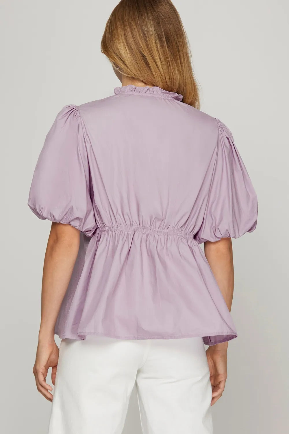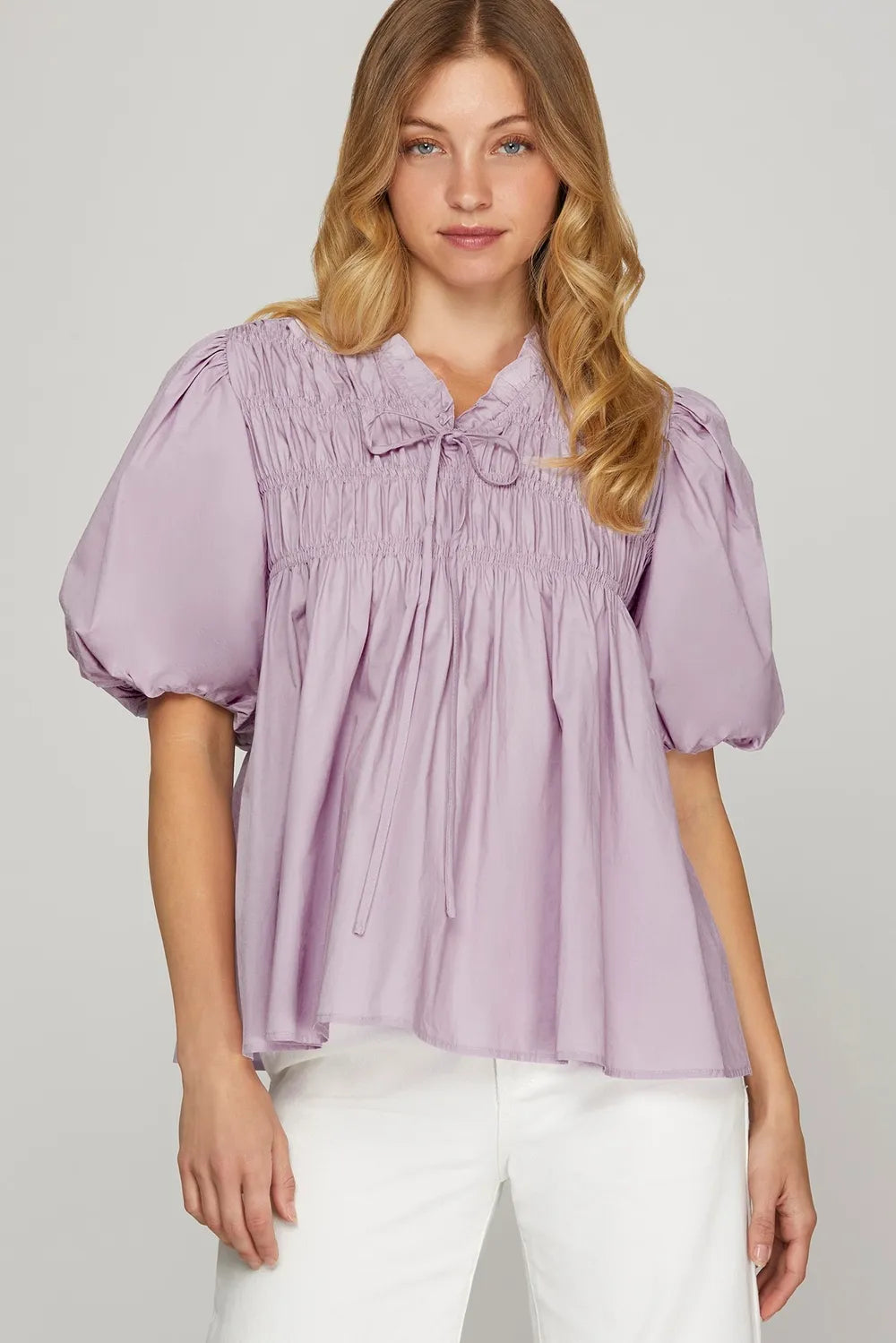 This woven blouse features a smocked front design that adds texture and detail. The puff sleeves create a trendy and voluminous look. Crafted from high-quality woven fabric for a chic and polished finish. Perfect for adding a touch of sophistication to your outfit.