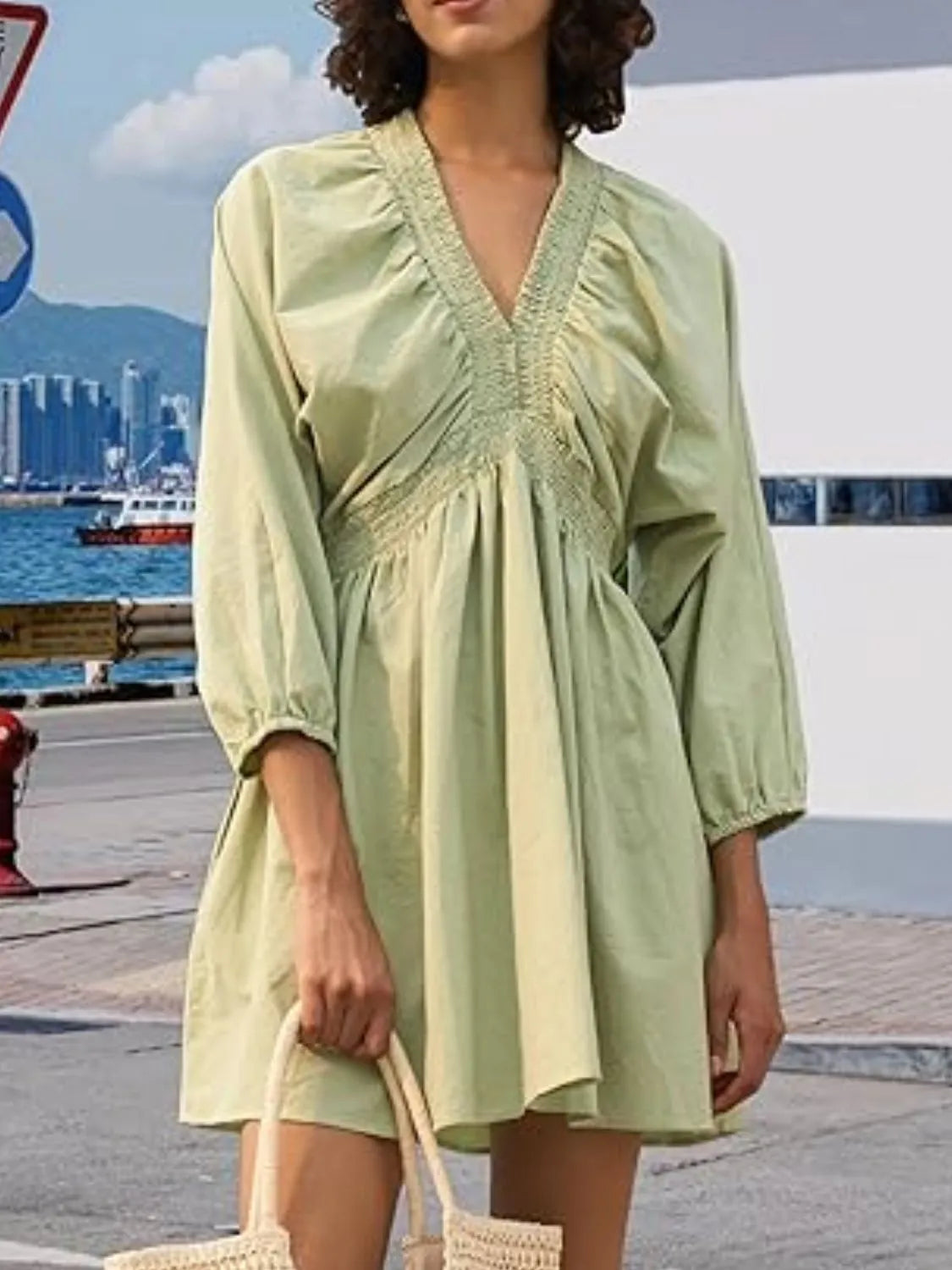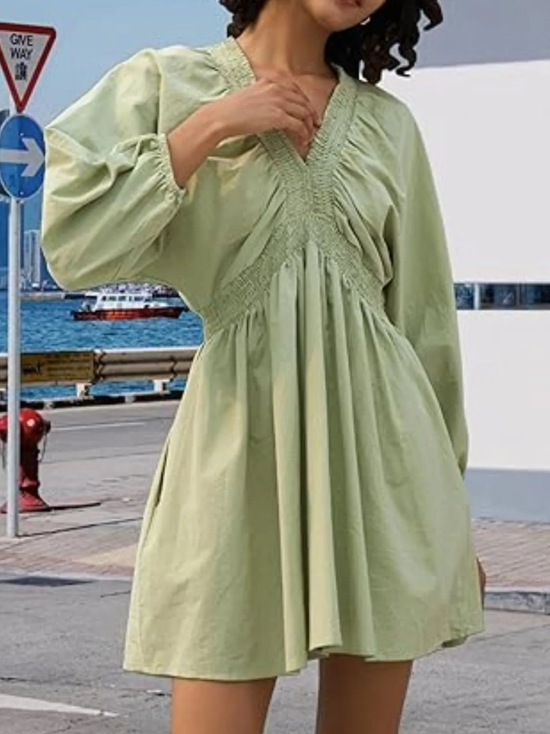 - Features: Ruched, Buttoned