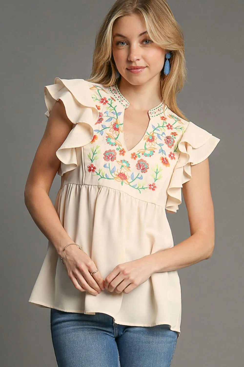 The Embroidery Notched Double Ruffle Sleeve Blouse is an elegant and sophisticated top featuring intricate embroidery details and stylish double ruffle sleeves with a notched design. This blouse adds a touch of femininity and charm to any outfit, making it perfect for both casual and more formal occasions. Pair it with your favorite pants or skirt for a chic and polished look that's sure to make a statement.