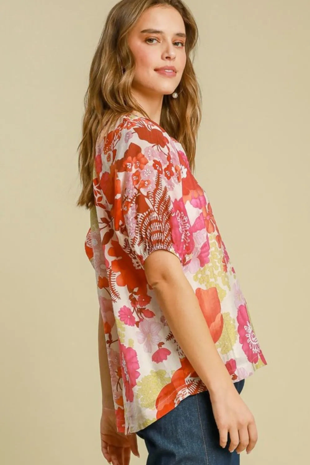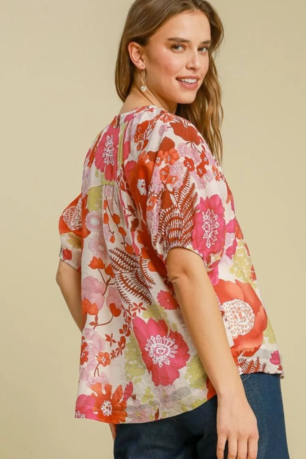 The floral print half button puff sleeve blouse features a pretty floral pattern and half-button detailing for added style. The puff sleeves add a touch of volume and femininity to the blouse. This versatile piece can be dressed up or down, making it a great choice for various occasions. Pair it with jeans for a casual look or with dress pants for a more polished ensemble.