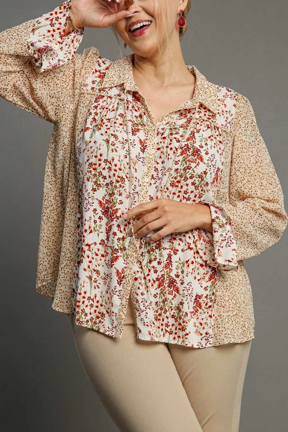 A button-down shirt with mixed prints and metallic details is a statement piece that is perfect for adding some flair to your outfit. The long ruffle sleeves add a feminine touch, while the metallic details give it a touch of glamour. This shirt would be great for both casual and dressy occasions. Pair it with tailored pants or a skirt for a chic and stylish look.