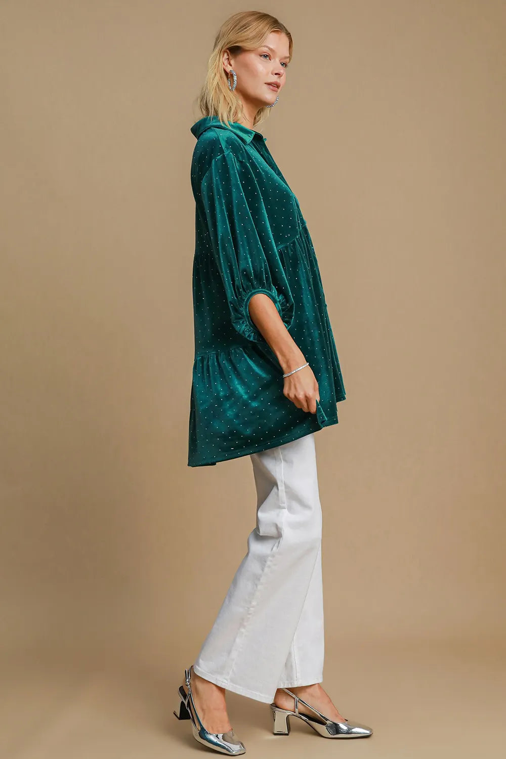 A polka dot collared neck button-up shirt is a fun and feminine top featuring a classic polka dot pattern. This type of shirt is versatile and can be styled in various ways, whether you're going for a casual or more dressed-up look. The polka dot print adds a playful and retro vibe to the shirt, while the button-up style offers a polished and put-together look. You can pair this shirt with jeans for a casual and chic outfit, or tuck it into a high-waisted skirt for a more sophisticated ensemble.