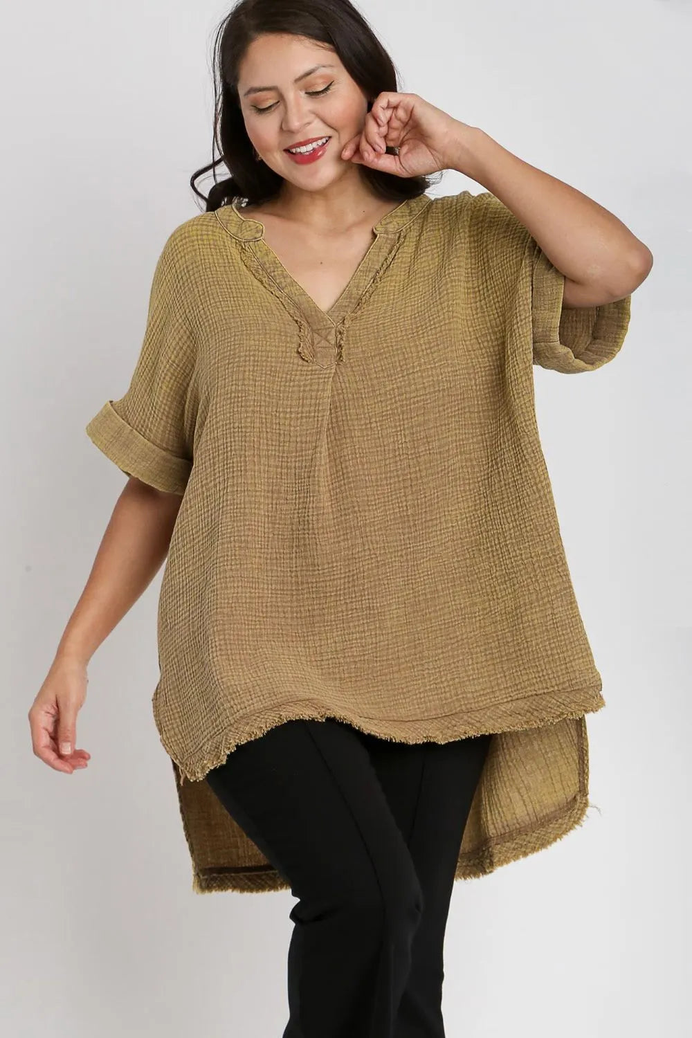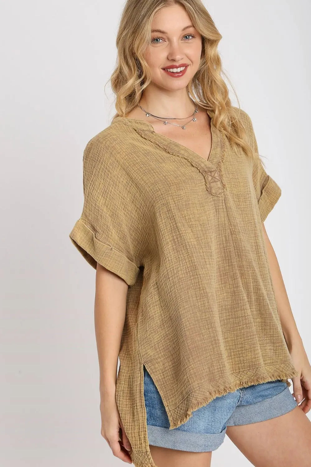 A side slit notched mineral wash gauze fabric top is a trendy and stylish piece that offers both comfort and a unique look. The mineral wash gives the fabric a vintage and lived-in appearance, adding a cool and relaxed vibe. The side slits and notched details provide a modern twist to the top, allowing for ease of movement and a touch of interest.