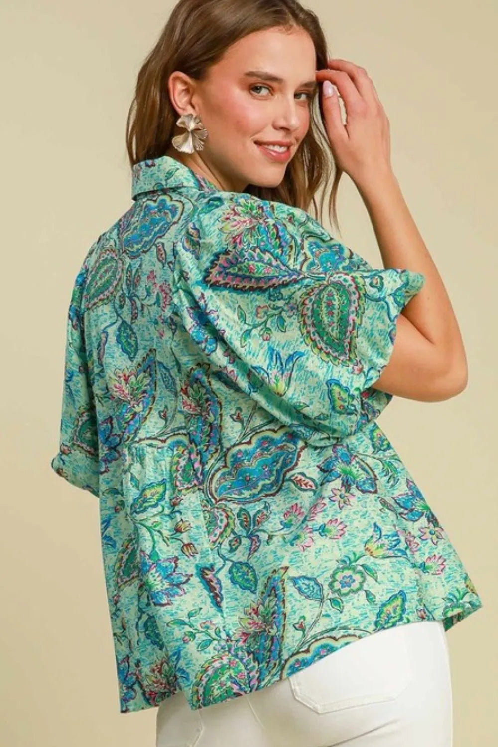 A woven abstract print Johnny collar puff sleeve blouse is a stylish and trendy top that combines unique design elements for a fashionable look. This blouse typically features an abstract print on a woven fabric, a Johnny collar neckline, and statement puff sleeves that add volume and visual interest to the garment.