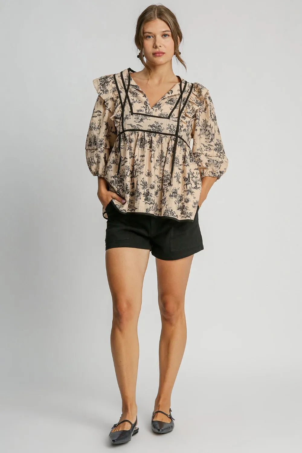 A ruffled tie neck puff sleeve babydoll blouse is a stylish and feminine top that features a ruffled neckline with a tie detail, puff sleeves, and a loose, flowy silhouette that cinches at the waist. This type of blouse is great for adding a touch of elegance and charm to any outfit, whether paired with jeans for a casual look or dressed up with a skirt for a more formal occasion. The babydoll style is flattering on many body types and is perfect for creating a relaxed, bohemian-inspired look.