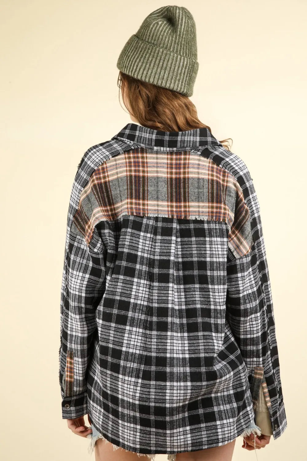 The Contrast Plaid Detail Casual Shirt Top is ideal for transitioning into early fall. This comfy button-down shirt features a blend of plaid details and raw edge accents, adding a touch of casual chic to your wardrobe. Its oversized fit and long sleeves ensure maximum comfort and a relaxed silhouette, perfect for cooler weather. The contrast plaid adds a pop of pattern, making this shirt a standout piece for autumn. Whether layered or worn on its own, it's a versatile choice for effortless style.